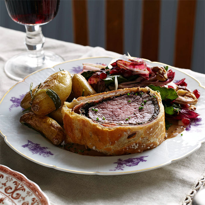 Нежная вырезка, запеченная в слоеном тесте с грибами, пармской ветчиной и горчицей
